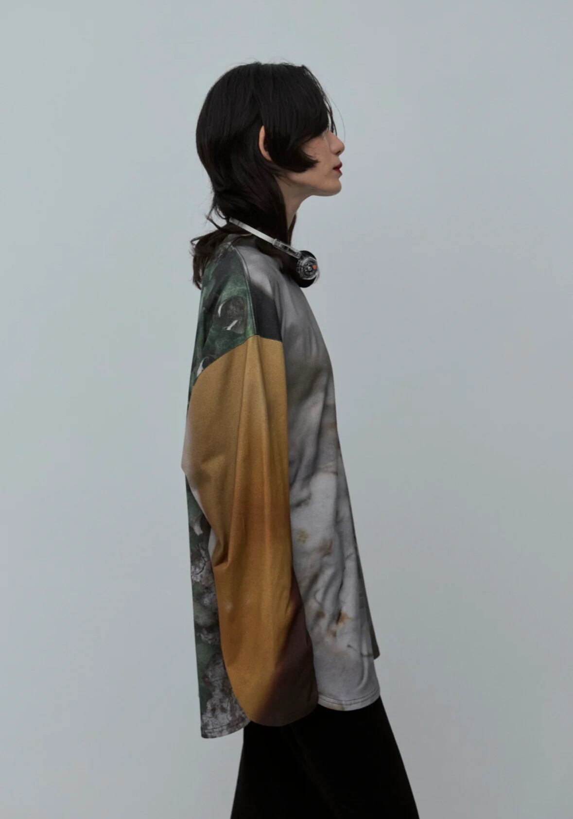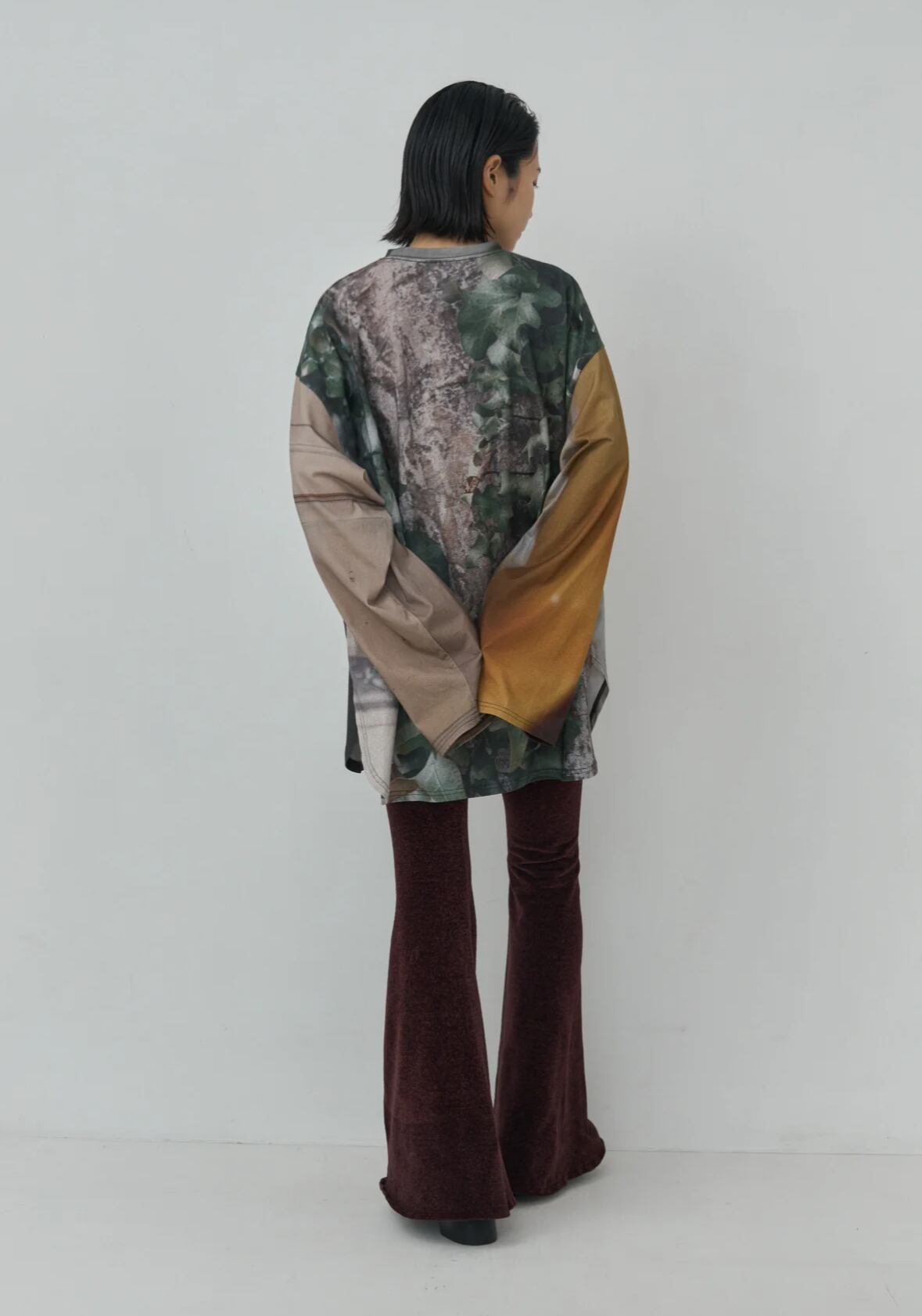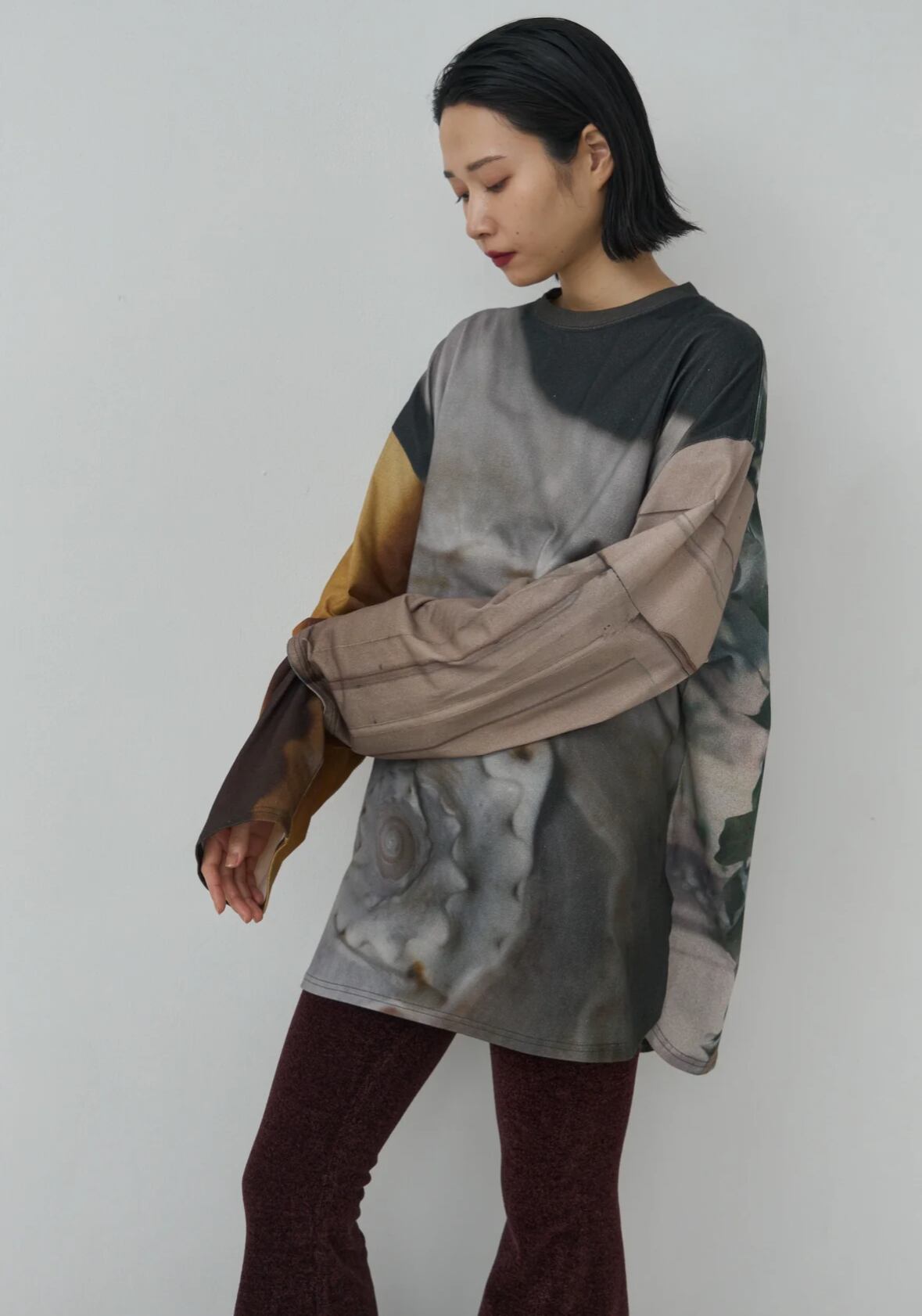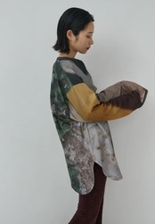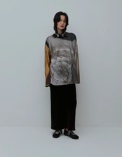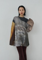 太く長い袖が特徴的な、ゆったりと大きいロンTeeに、 デザイナーが撮り下ろした、さまざまな写真の断片をデザインしてプリントしました。