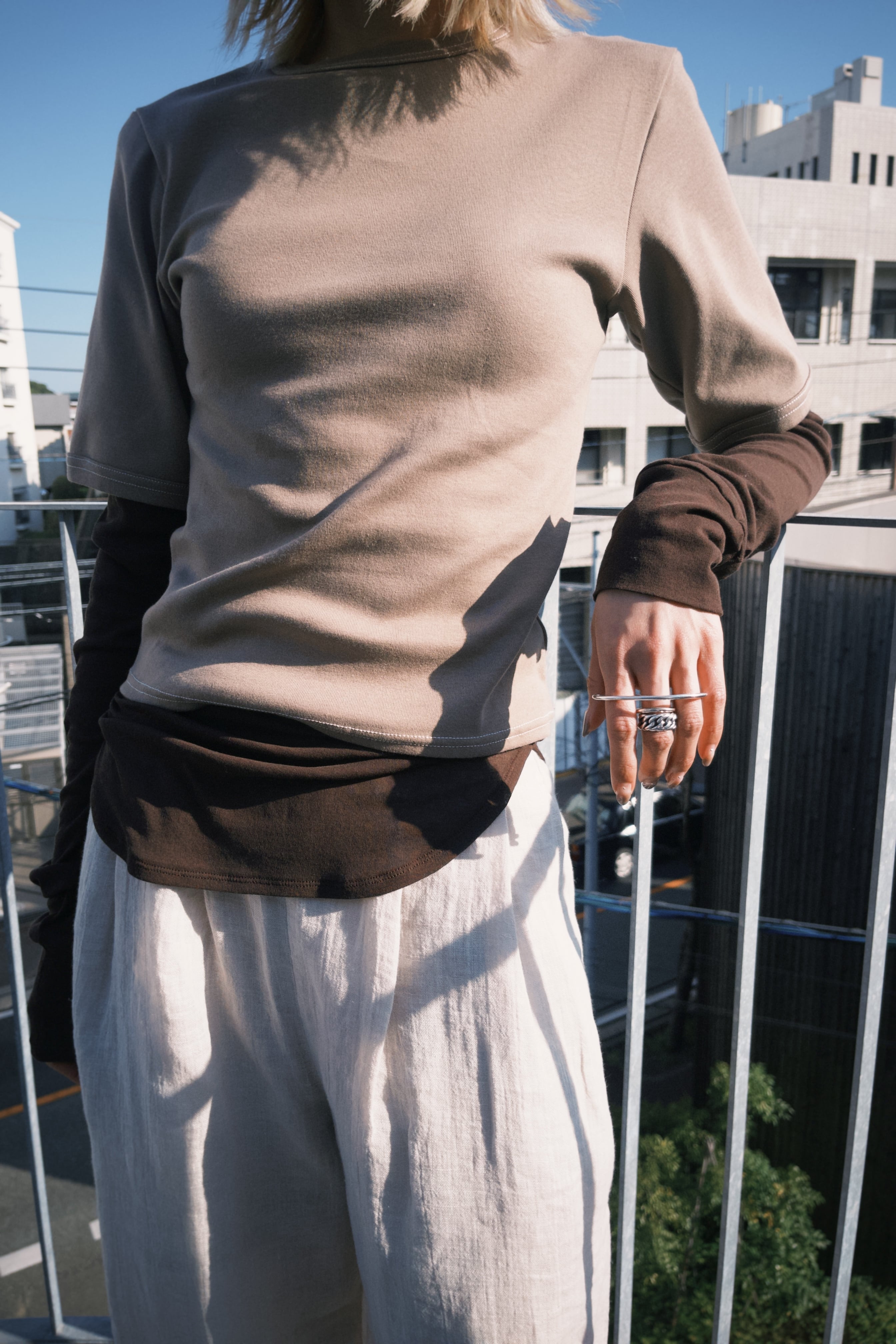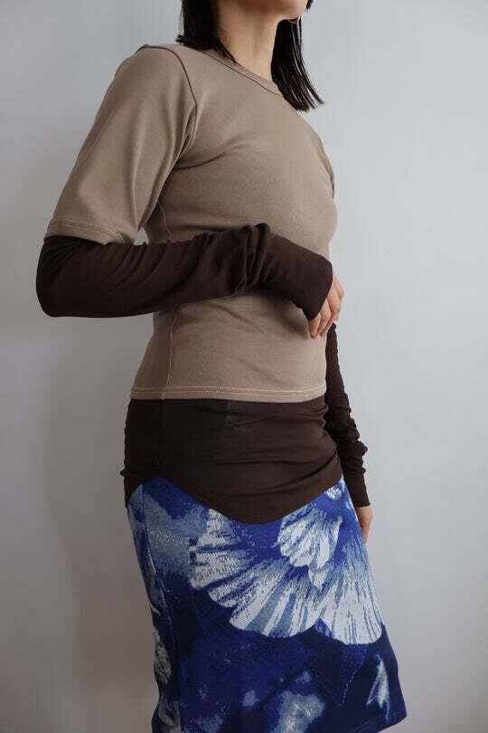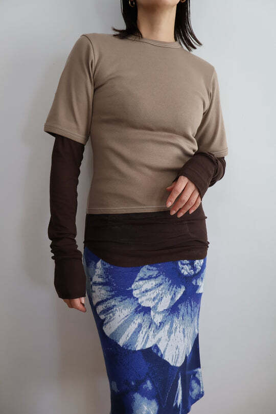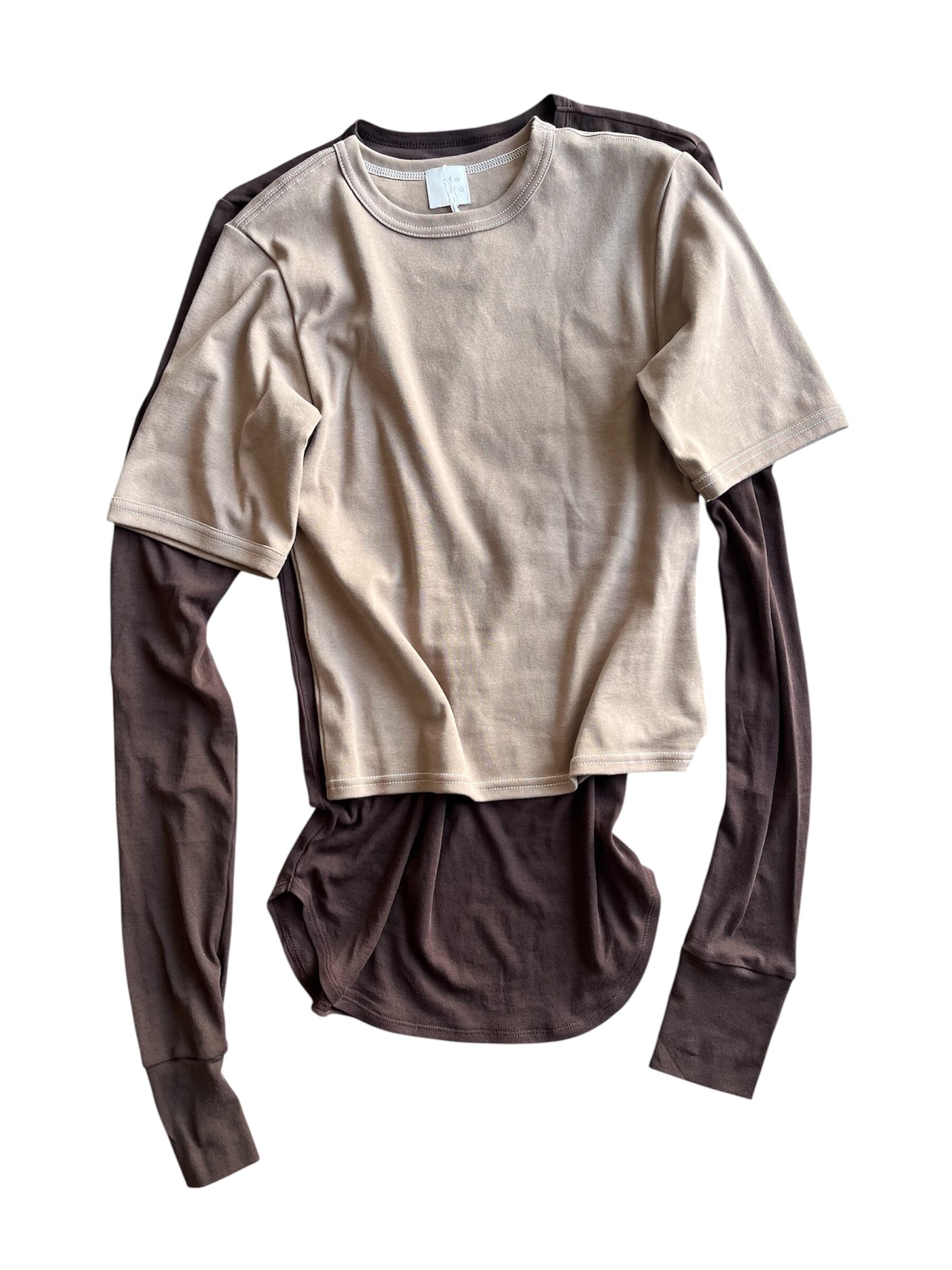 表のTシャツは厚みのあるフライスでステッチを白に。 下重ねたロンTは、シアーなハイツイストフライスで繊細に。