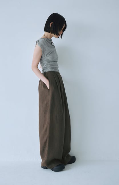 リラックスしてご着用いただけるように後ろ身頃はゴム仕様になっておりますが、正面にはタックを4本デザインすることで構築的で品のあるシルエットになっています。