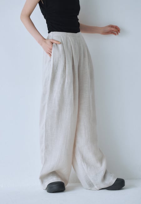 表情感があるしわ感が特徴のリネン100%のワイドパンツ。